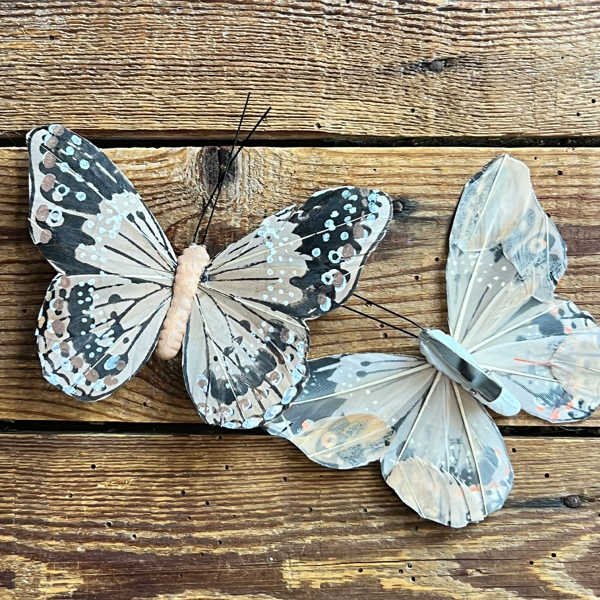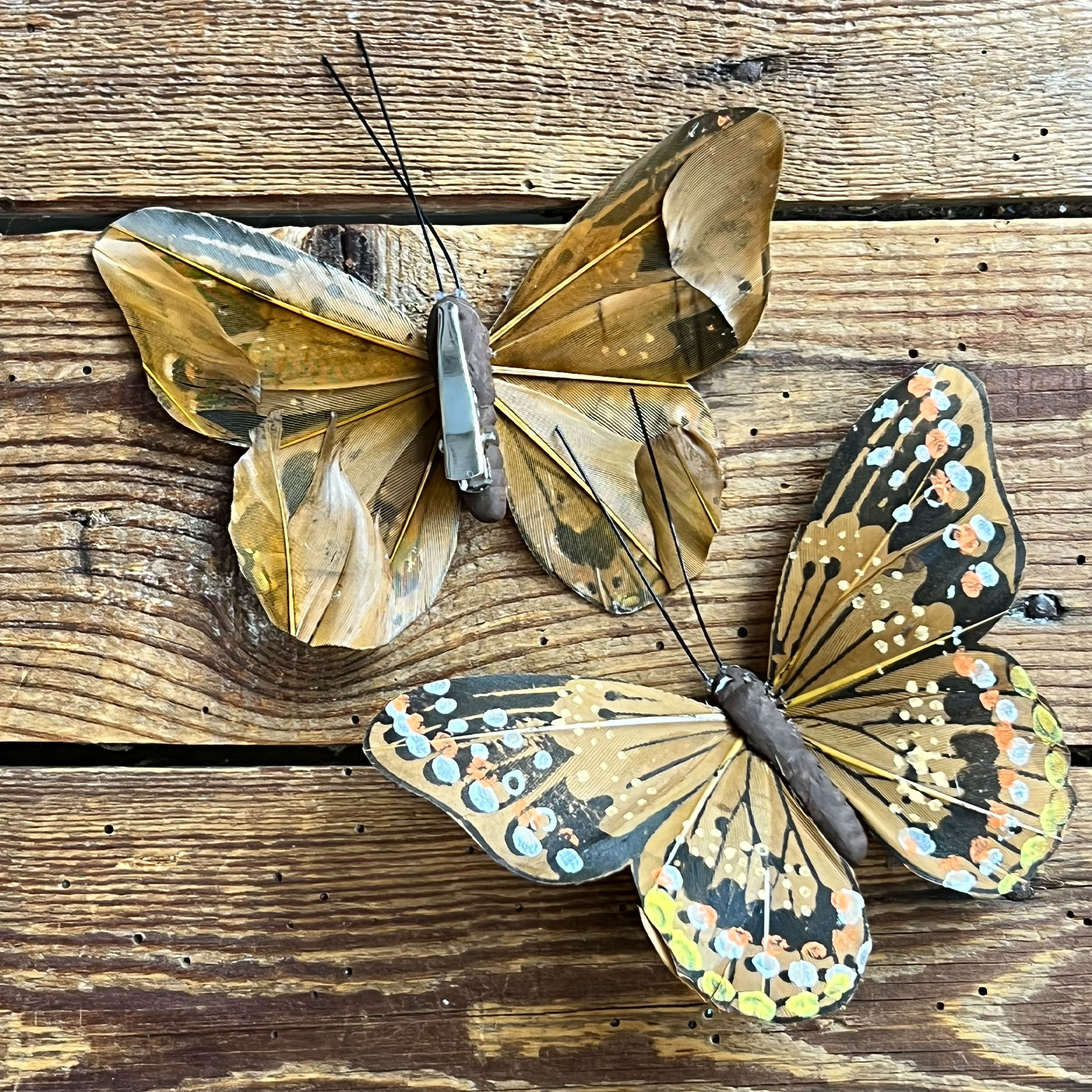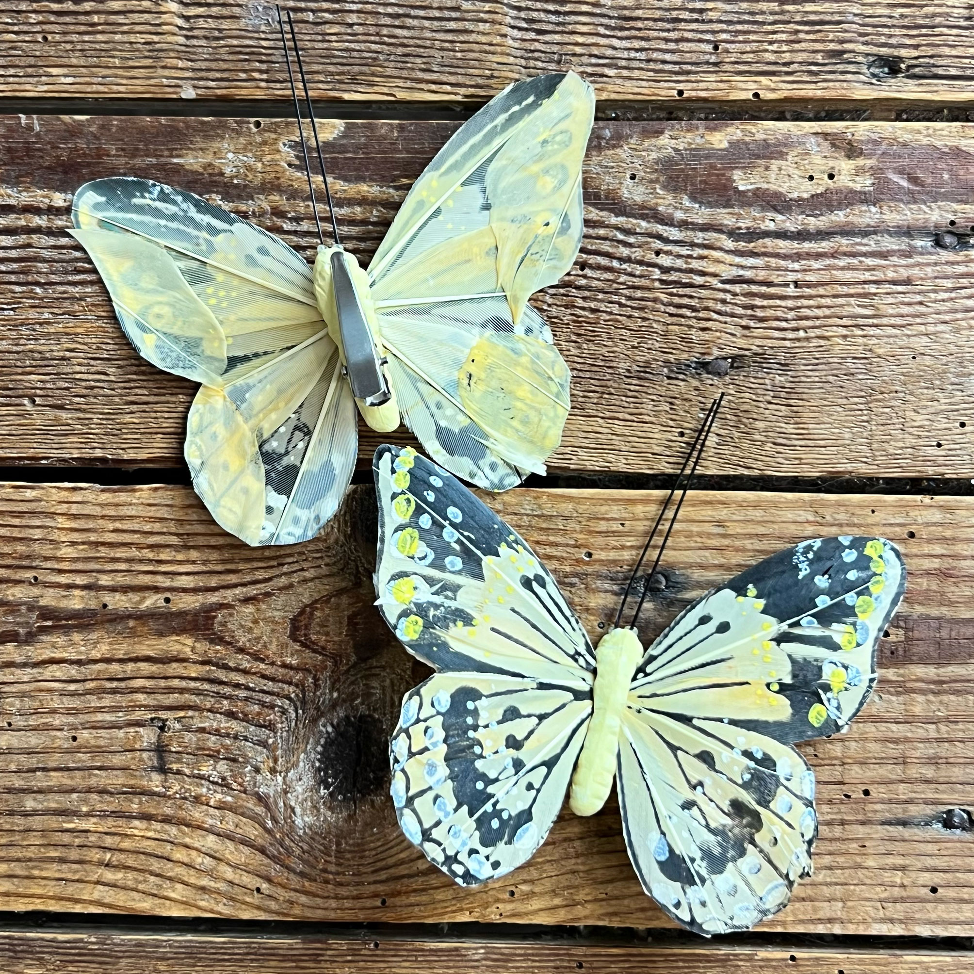 La farfalla è realizzata con piume decorate a mano, un dettaglio che la rende particolarmente curata e originale.