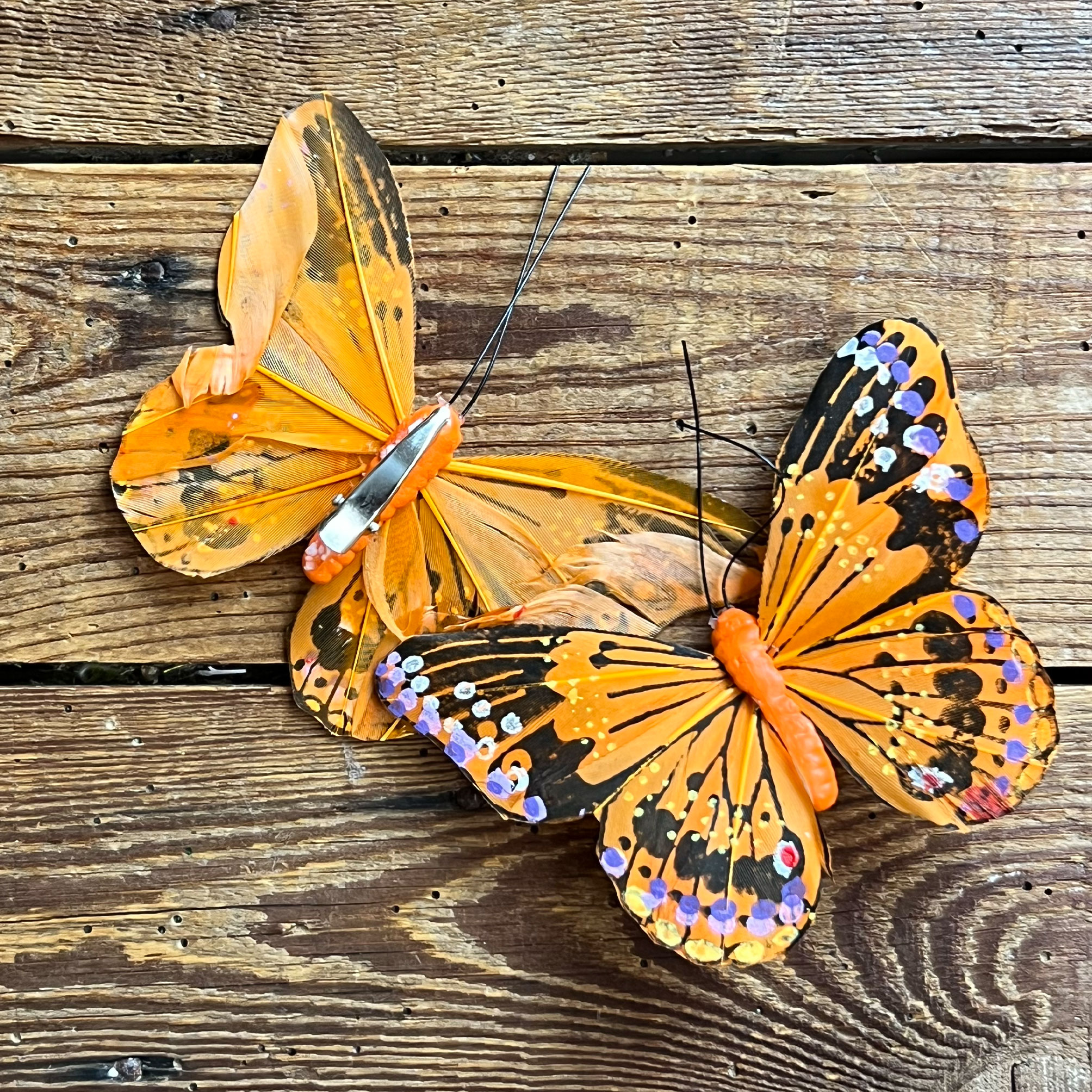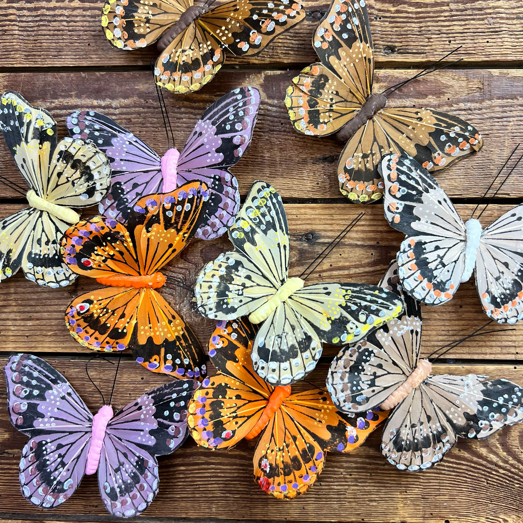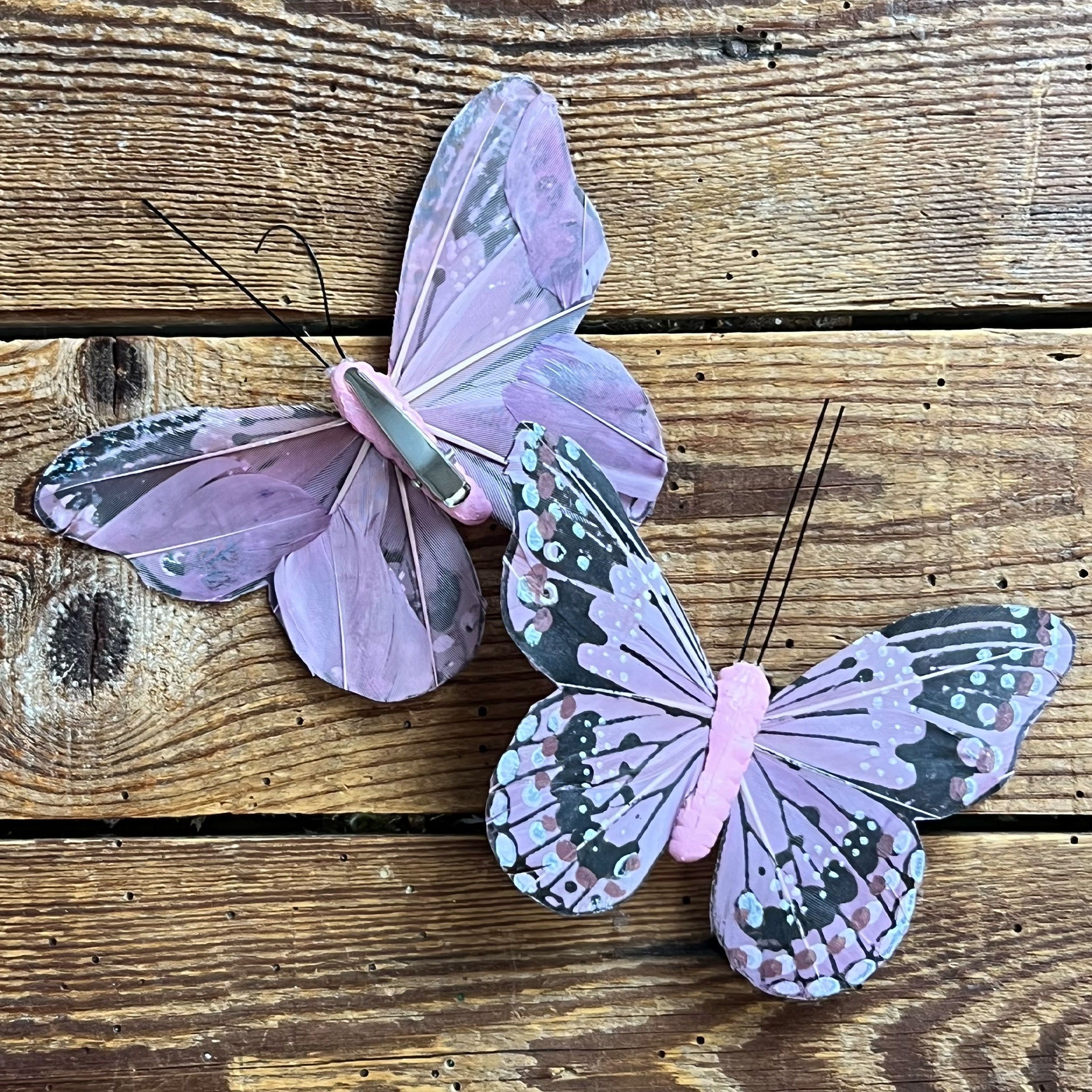 La farfalla è realizzata con piume decorate a mano, un dettaglio che la rende particolarmente curata e originale.