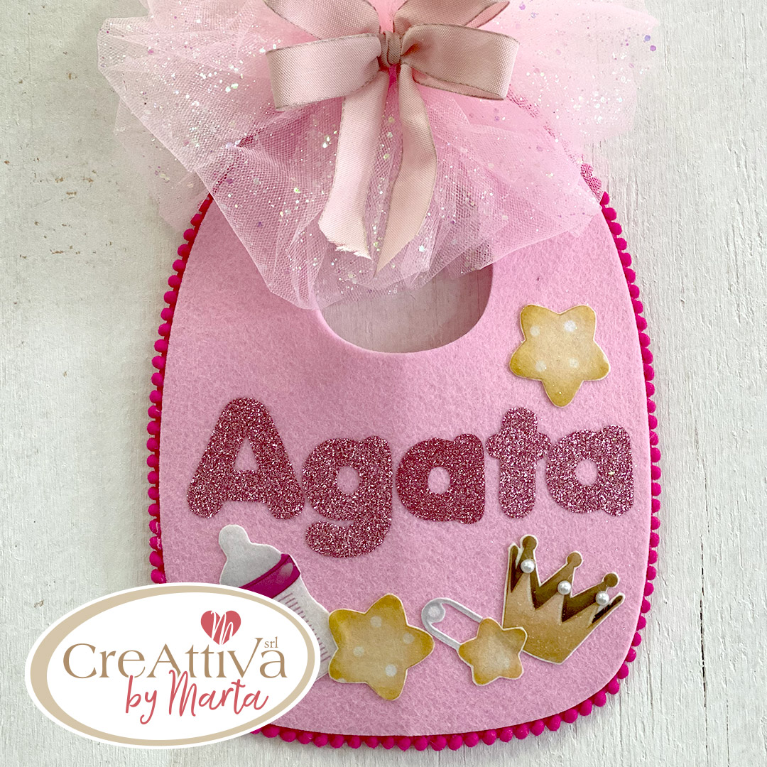 Per la REALIZZAZIONE del kit ti serve anche: Cartamodello Stencil Alfabeto Maiuscolo (cod. CRSTE047 ), Cartamodello Stencil Alfabeto Minuscolo (cod. CRSTE048 ), Fustella Bavaglino (cod. CRFS0036), Pistola a Caldo (cod. CRACC030), Penna Evanescente (CREVAN01).