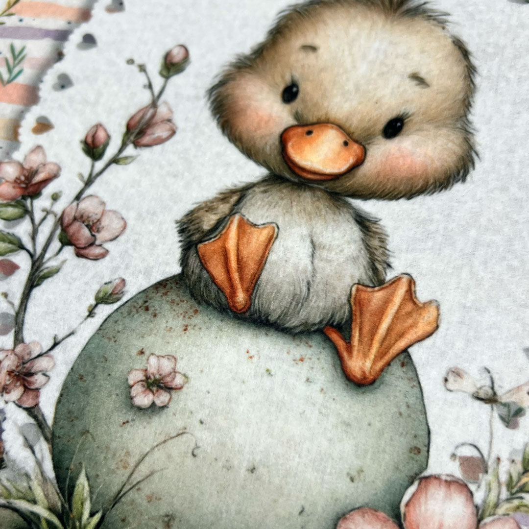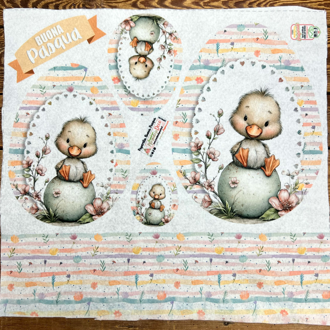 Da una parte hai un motivo in tinta perfetto come fondo o per creare dettagli coordinati, dall’altra trovi le sagome delle ovette di Pasqua da ritagliare e imbottire, con un personaggio simpaticissimo e decorativo: la paperella 💛